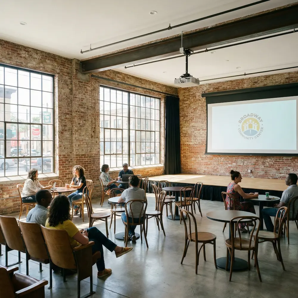A multipurpose community center with flexible rooms and a small auditorium for talks, classes, and local performances.